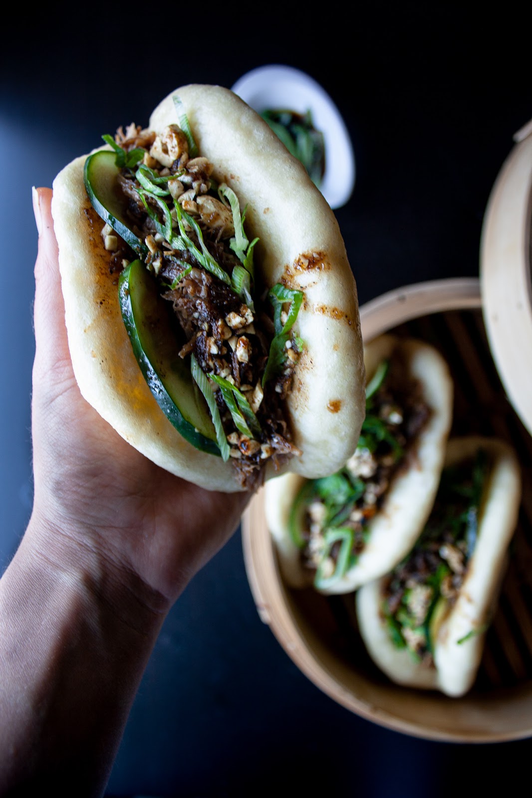 Gua bao, pan bao chino relleno de costilla deshilachada, salsa con anacardos y pepinos encurtidos