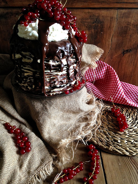 Tarta de crepes de chocolate, crema de dulce de leche y grosellas